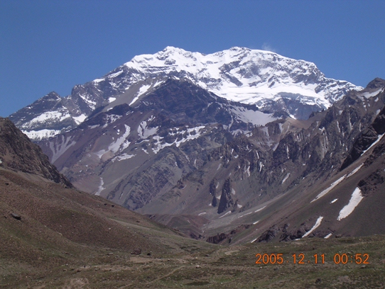 | この写真はオルコネス渓谷の吊橋の1km手前ぐらいで撮影したのですが、以前から見たかった南壁が右手によく見えます。中段には懸垂氷河が架かっています。手前の黒い三角の岩峰はピラミダルピークという前衛の山で、高度は5700mです。アコンカグア南壁は、フランスの登山家ロベール・パラゴ、リシュアン・ベラルディーニらによって1967年に登攀されました。これに因んで、南壁側のベースキャンプは「フランス広場(標高4250m)」と呼ばれています。今は亡き長谷川恒男さんも1981年冬にこのルートで単独登攀を成功させています。 さあ、ここまで読んで「アコンカグア峰に登頂したい」と考えている人にアドバイスです。私はまだ登頂していませんが、高校の先輩は70歳で登頂しました。この先輩によるとプラサデムラス経由の通常ルートではクライミングロープとアイスバイルを使って垂直の岩壁や氷壁を登るような難所はないとのことですが、基本的な雪山装備と経験は必要であり、あとは行程が長いので基礎的な体力が必要、なおかつ高所に順応するためと、しばしば天候の回復を待つ必要があるため十分余裕のある日程プラス現地ガイド傭上が必要とのことでした。日程についてはオンシーズンに入山してから2週間強あれば大体登頂・下山できるらしいです。 |