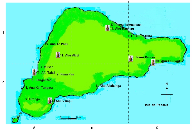 3.Ahu Tahai 村のはずれにある、有名な目のあるモアイ。 4.Ana Kai Tangata 食人洞窟 5. Orongo Rano Kao 死火山 6. Ahu Vinapu アフ(祭壇)の石組み 7.Puna pau プカオ(モアイの帽子)の製作所 8. Ahu Akahanga 9. Rano Raraku 正座するモアイ 10.Ahu Tongariki 日本の会社が修復した15体のモアイ 11.Te PitoKura 「光のへそ」 12. Playa de Anakena アナケナ海岸 13.Ana Nau Nau プカオをかぶりふんどしの5体のモアイ 14. Ahu Akivi 海を見つめて立つ7体のモアイ 15. Ana Te Pahu 洞窟 |
